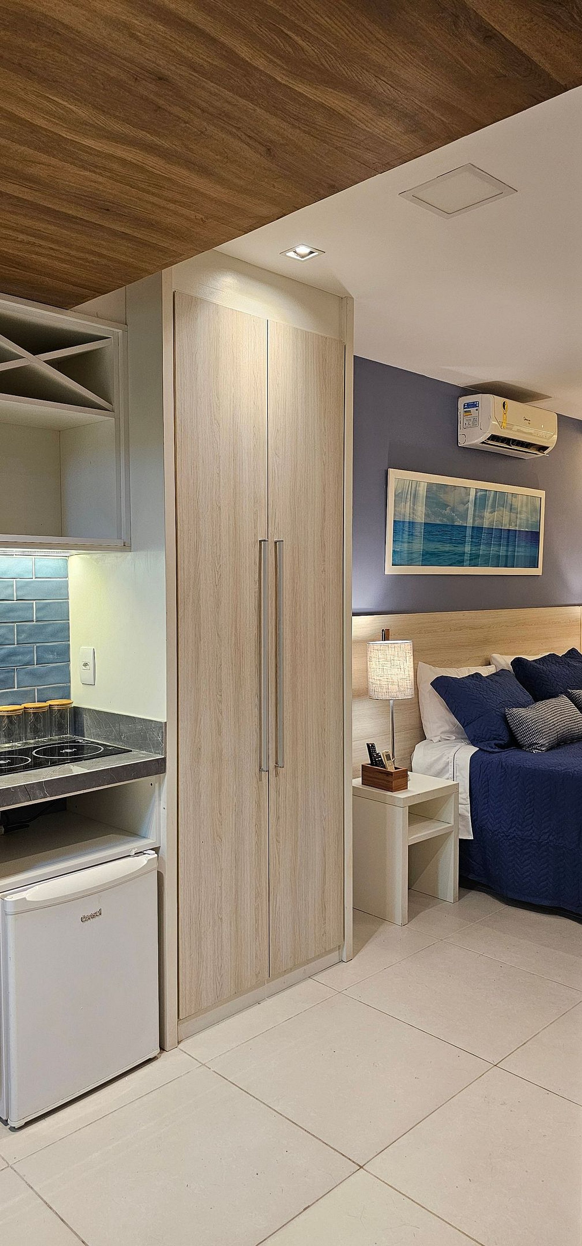 Aconchegante suíte com vista livre para o verde e horizonte urbano, finamente decorada por arquiteto, equipada com cama de casal queen size extremamente confortável com enxoval em 400 fios de algodão, ar-condicionado split, tv, armário guarda-roupas, aparador para home office e cozinha compacta com armários embutidos, bancada em porcelanato com cuba e torneira gourmet, microondas, sanduicheira, cafeteira e frigobar.